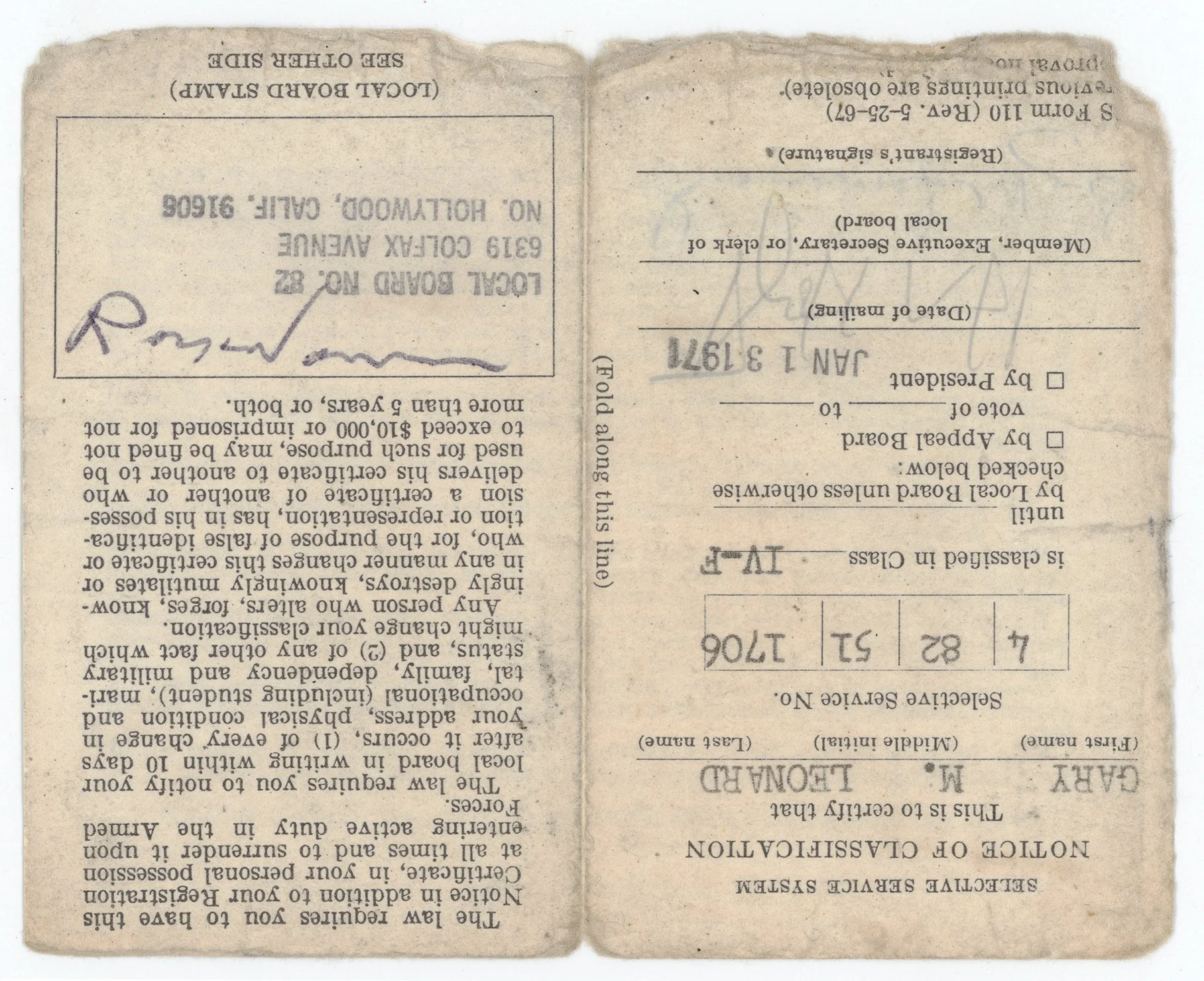 GARY: Yeah. It's referred to, your back goes out. It's horrible. You can't move. However, it gets better. I got over it, and I had no problem. I was still doing gymnastics, but my mom got the bright idea to take me to build a medical history around my back, and she would take me to the doctor regularly to build up that history. At 18, you registered for the draft. My mom gave me a letter and a packet to leave with the draft board. When my draft card came, I had a 4F.