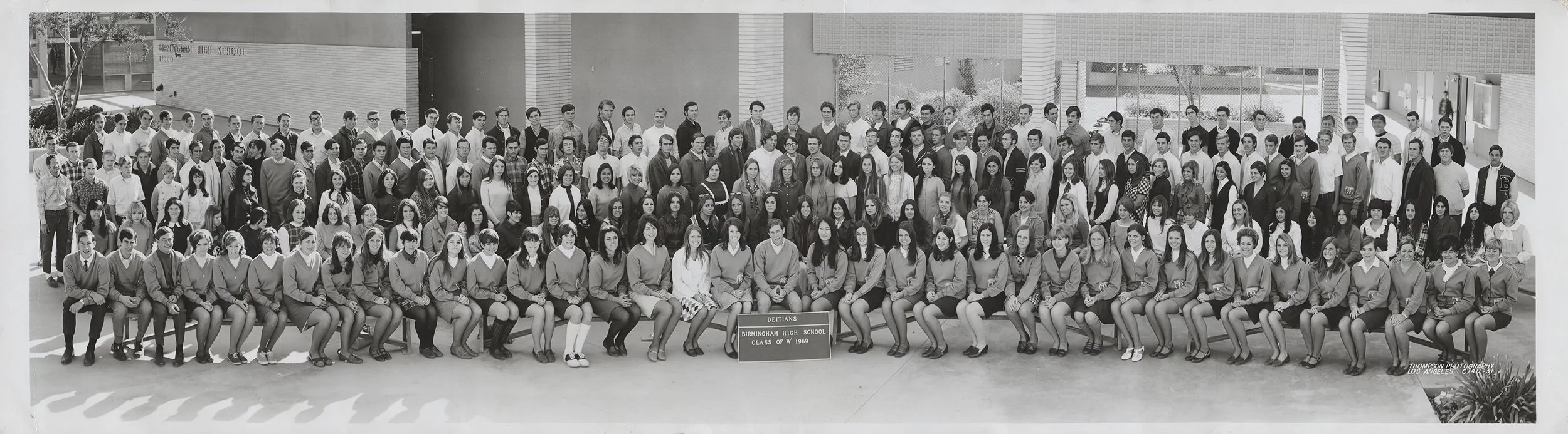 GARY: Yeah. I went to Portola Junior High School, which was in Tarzana. In the ninth grade, we had a senior picture, and if you're familiar with senior photos, they're long and they're basically contact prints of a very large negative. You have a lens, and if you get even the widest angle, I've got to get so far back that it's wasted space. At some point, and they're probably very old, because you see on panorama cameras, you were able to get up close and had a lens. The group would wrap around the camera, and the lens would go from, ‘Hold, very still, everybody hold very still.’ I saw that in ninth grade and promised myself that in 12th grade when they did it again, that I would get on one side and go to the other. So, when you ask about standing out in your class, I stand out more than anybody else in the whole class.